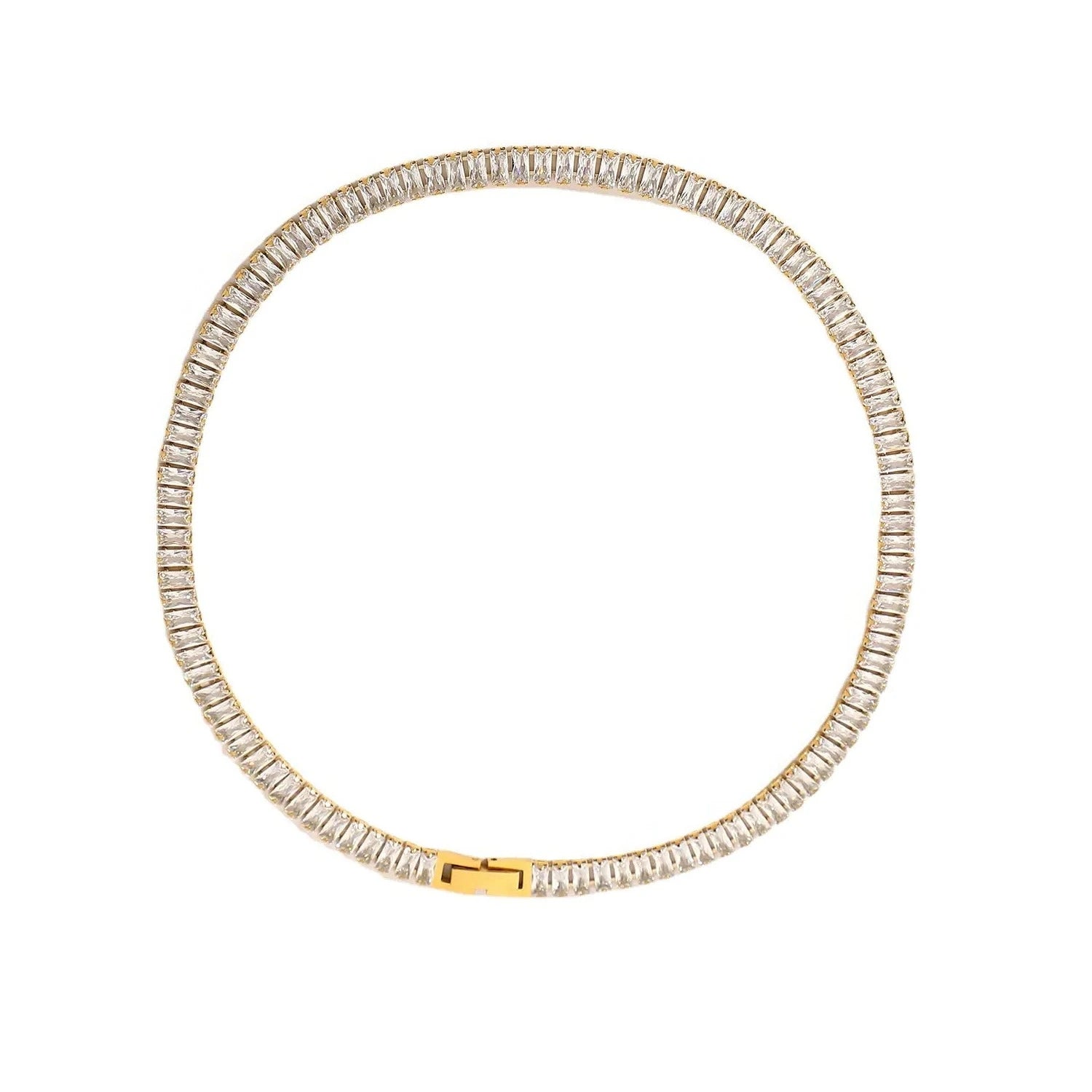Introducing our "Tennis" Full Diamond Zircon Chain Necklace — a showstopping piece that effortlessly combines opulence and enduring elegance. Crafted with meticulous attention to detail, this necklace features a luxurious chain made from high-quality stainless steel, plated with dazzling 18K gold, and adorned with brilliant full diamond zircon accents.